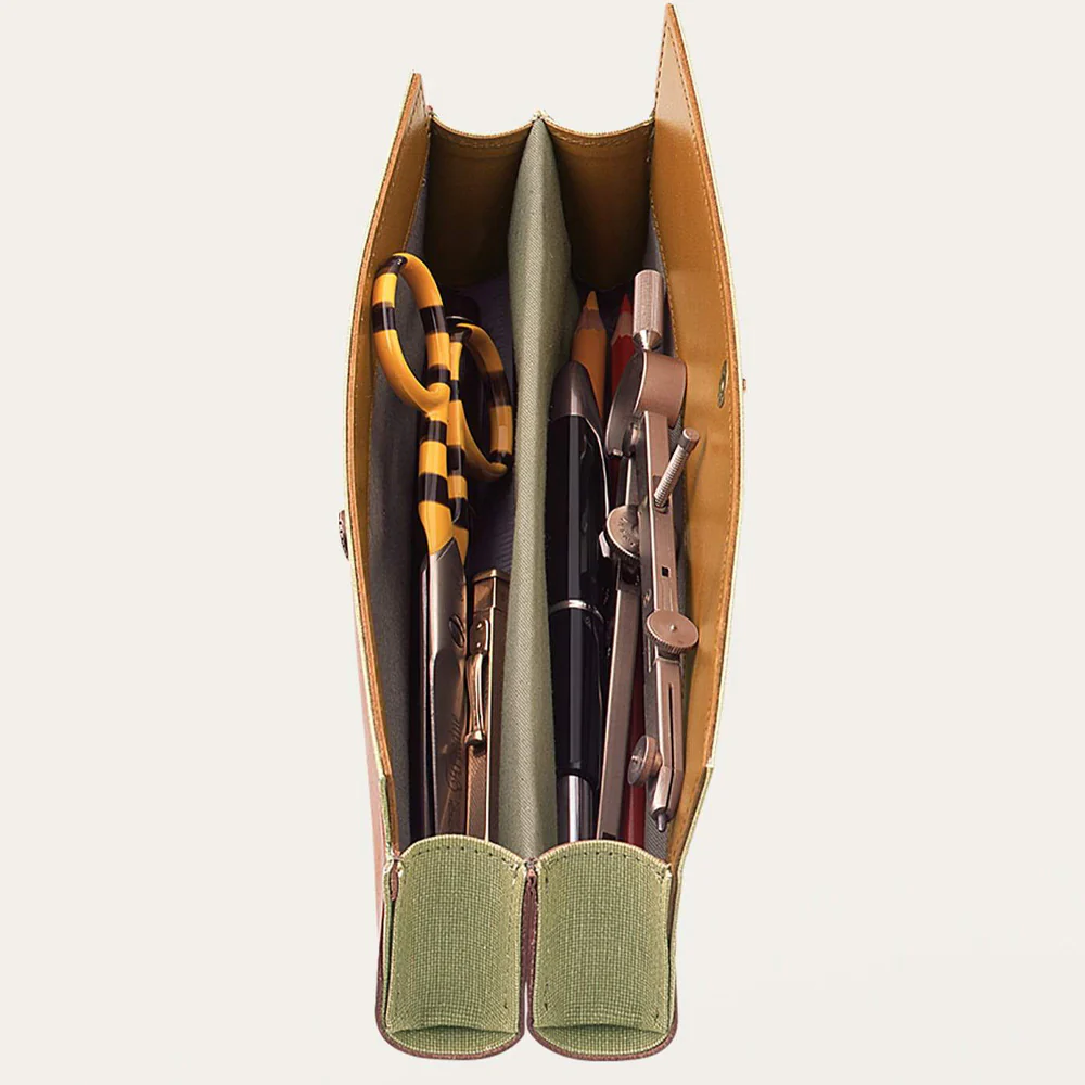 A clever design results in a case with high capacity, portability and easy access to contents. Made of hard wearing pressed cotton and supple cowhide.
